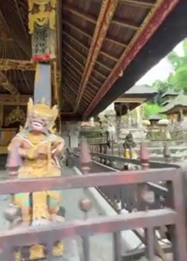 n outdoor view of a Balinese temple. The camera pans up to reveal a series of stone steps leading to several small temple buildings with traditional Balinese architecture, including tiered roofs. At the bottom of the steps, there are statues of deities. The sky is cloudy with patches of blue, and there are palm trees and lush greenery in the background.