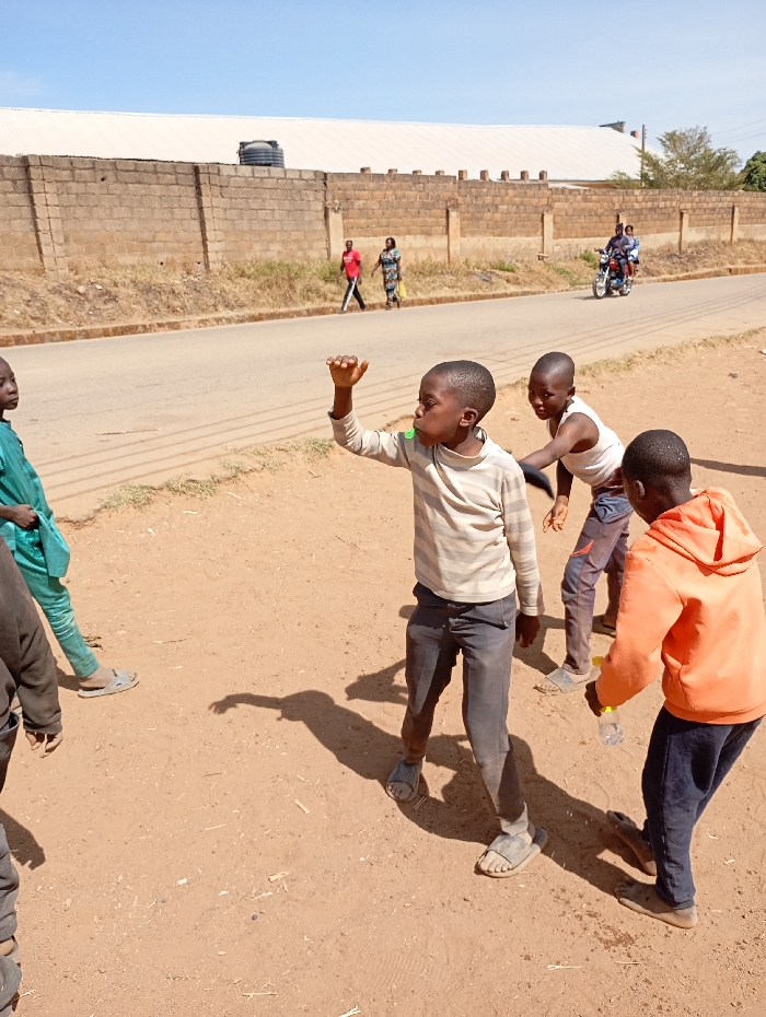 The image portrays an outdoor scene in Jos, Nigeria, on a bright, sunny day, indicated by strong shadows on the ground