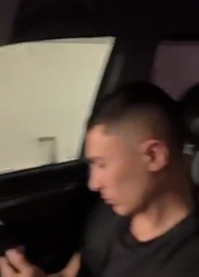 Inside the dimly lit interior of a car, a young woman with long, light brown hair leans forward from the back seat