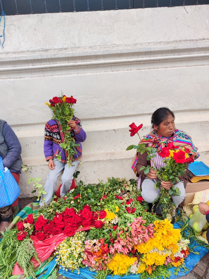 - "The scene depicts an outdoor flower market in Cuzco, Peru, set against a light-colored, weathered multi-tiered wall with a dark metal railing above" by FM-20kwN2, licensed under CC BY 4.0