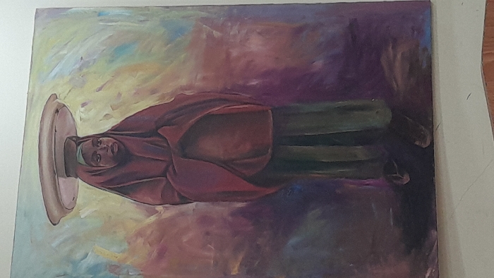 This image is a photograph of a vertical oil painting, currently located in Lafia, Nigeria