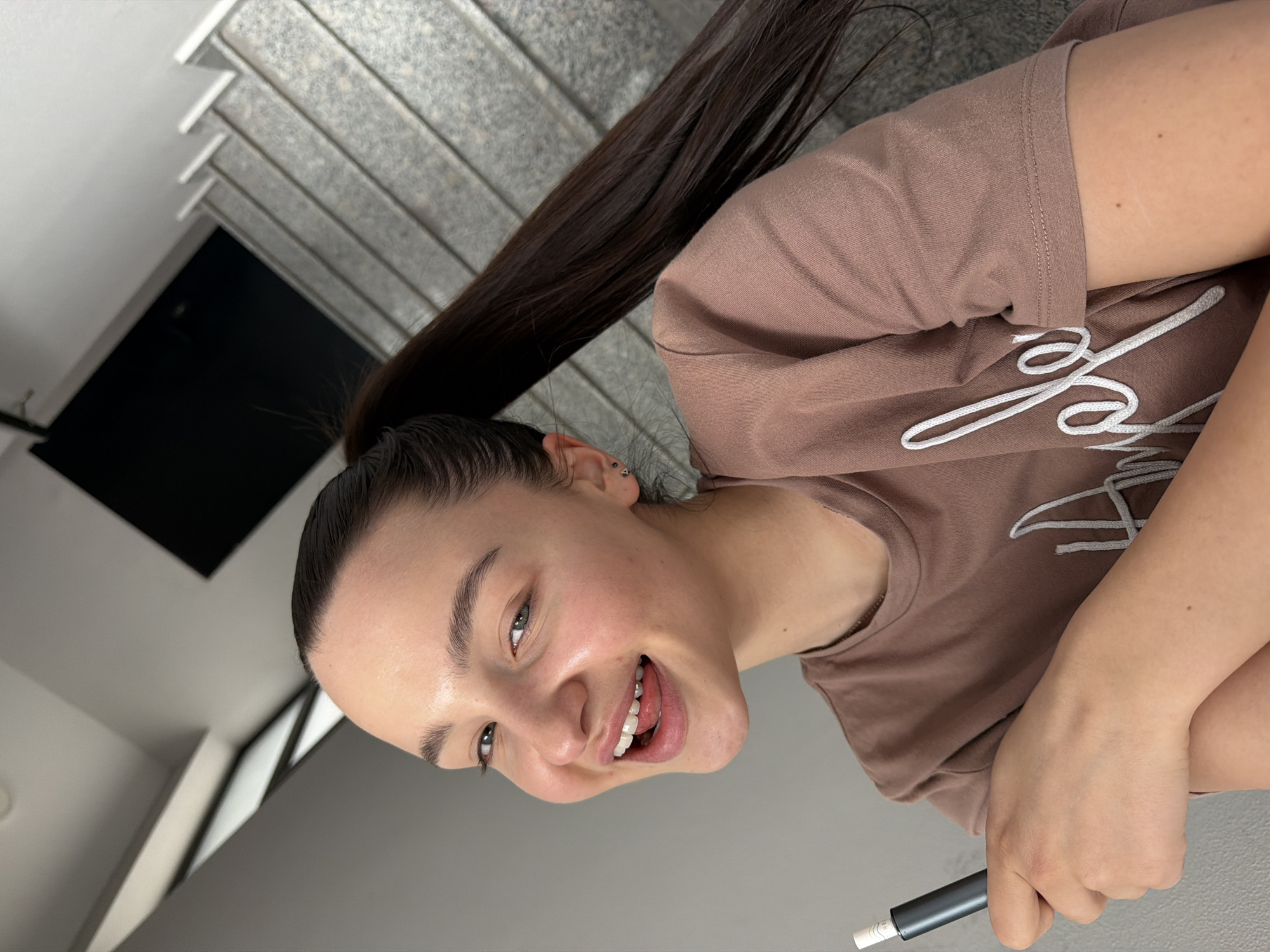 A young woman stands indoors with a staircase in the background. The staircase consists of concrete steps and a white wall. She has dark hair pulled back in a ponytail. She wears a brown t-shirt with white writing. In her hand, she holds a black and silver device, which she appears to be using. The location is Sofia, Bulgaria.