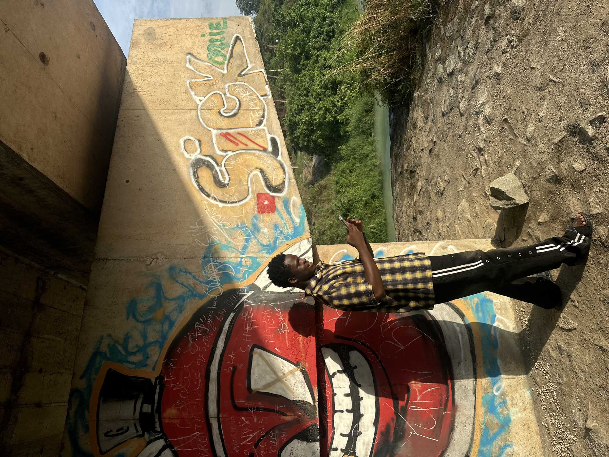 young, black man standing sideways on a concrete structure that appears to be part of a bridge or overpass. The walls of the structure are covered in graffiti. He is dressed in a yellow and black checkered shirt and black pants with white stripes down the sides. He seems to be looking at a mobile phone in his hand. The background shows greenery and a body of water, presumably a river or stream. The OCR text suggests the location is Ihiagwa, Nigeria, given the names present in the graffiti.