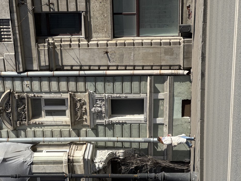 A street scene in Saint Petersburg, Russia, is depicted under bright daylight. In the foreground, an asphalt road displays two solid white parallel lines. A grey concrete sidewalk with a raised curb occupies the midground. A single female pedestrian walks from left to right across the sidewalk. She is dressed in a light-colored long coat, blue jeans, and light-colored shoes, holding a small dark object in her left hand. The background features two adjacent multi-story buildings. The left building presents an ornate, greenish-grey facade adorned with decorative window frames, cornices, and architectural embellishments, including a grotesque mask above a lower window and a lion head corbel beneath an upper bay window. An upper left window is partially obscured by a grey tarp. A segment of a black ornate lamppost is visible on the far left, with bare tree branches clustered near its base. The right building exhibits a plainer, grey, concrete-textured facade with vertical fluted elements. It contains two large rectangular windows; the upper has a dark frame, and the lower features a dark frame with reflective glass. A light-colored downspout runs vertically along the shared boundary of the two buildings. Graffiti, reading "FLOOD," is present on the lower section of the right building's wall next to the downspout. A small, dark, rectangular utility box or bin rests on the sidewalk in front of the right building. Strong sunlight illuminates the scene, casting distinct shadows across the building facades and the sidewalk.