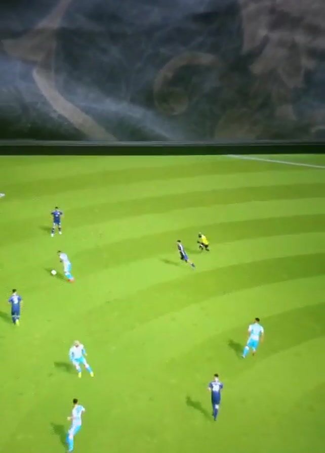 person holding a smartphone, recording a soccer game being played on the screen. The game is in progress, with players in blue and white jerseys moving the ball towards the goal. The opposing team's goalkeeper, wearing yellow, defends the goal. The camera angle is slightly tilted, and the background features a blurred, dark-colored patterned surface. The game displays ads for "Score! Hero" along the sidelines. The environment appears to be indoors.