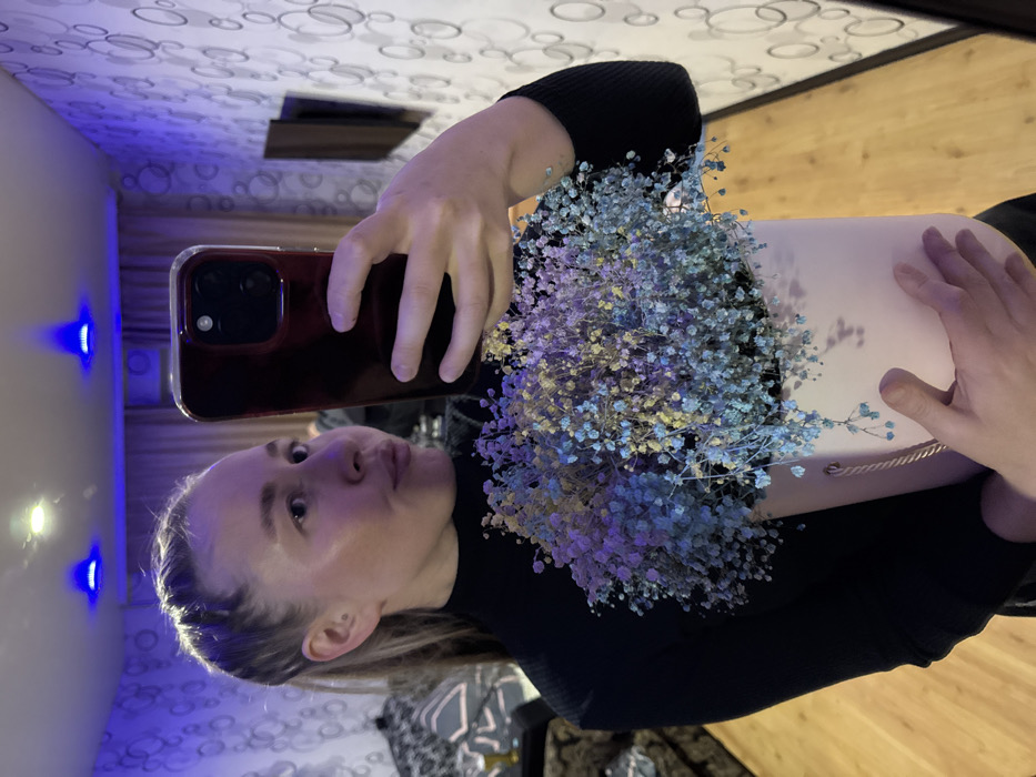 A female individual is captured in a mirror selfie within an indoor setting in Chaikovsky, Russia. The individual, appearing to be a young adult with light-colored hair pulled back, is wearing a black long-sleeved top. She is puckering her lips towards a dark red smartphone, likely an iPhone model due to its camera array design, which she holds in her right hand to take the photo. Her left arm supports a pale pink cylindrical box containing a dense bouquet of small, dyed flowers in shades of light blue, purple, and yellow. The reflected background features a wall adorned with light-colored wallpaper displaying a pattern of concentric circles. A dark, rectangular object is mounted on this wall. The adjacent wall is covered with light-colored curtains, and a dark piece of furniture, possibly a sofa, is partially visible. The floor is constructed of wooden planks. The white ceiling contains two recessed spotlights emitting a distinct blue light. The scene is illuminated by artificial light.