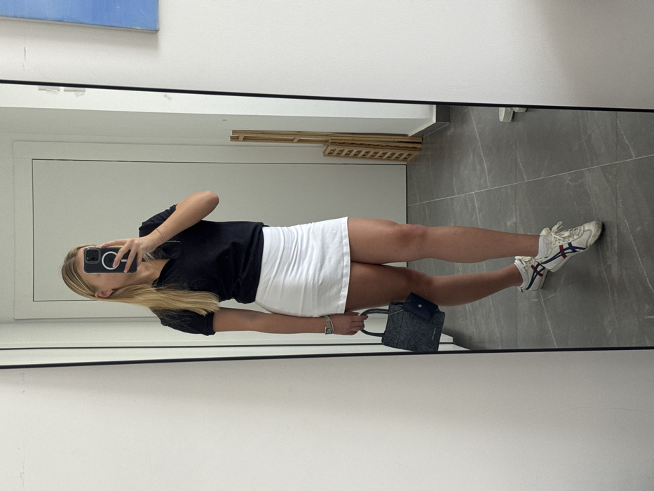 A fair-skinned person stands in front of a mirror, taking a photo with their phone. The person is wearing a black T-shirt and a white mini skirt. They are wearing white sneakers with red and blue stripes. They are holding a gray textured bag with a navy blue coin purse attached. The mirror reflects a gray tiled floor and a white door. A blue abstract painting is on the wall above the door.
