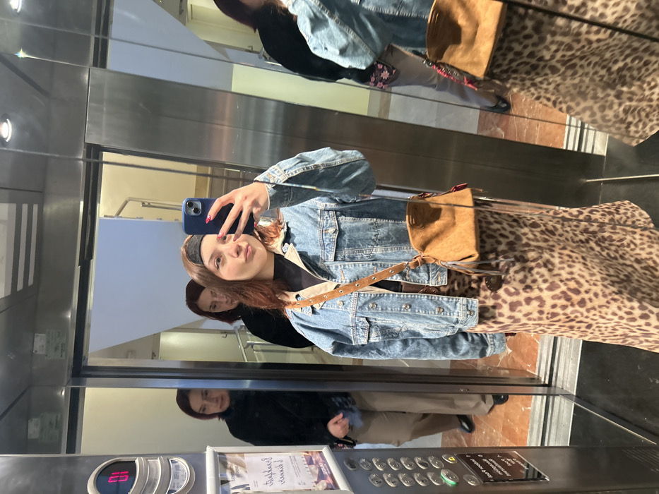 A woman in an elevator takes a selfie. She wears a denim jacket, a black top, a leopard-print skirt, and a headband. A brown purse hangs across her body. The elevator's mirrored walls reflect the scene, showing her reflection and another person behind her wearing a black jacket and beige pants. Elevator buttons and signage are visible in the foreground.