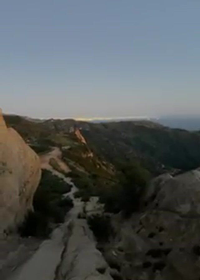 landscape view from a rocky, mountainous area. In the distance, a city's lights are visible under a clear, pale sky. The foreground features large rocks and a narrow, winding path leading down through the green, hilly terrain. The light suggests it is dusk or dawn. There are no people visible in the scene.