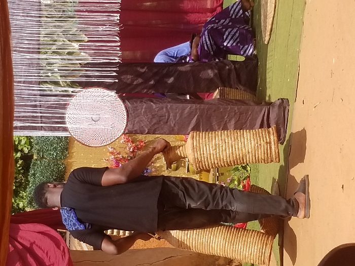 In Ochadam, Nigeria, a man stands in an outdoor, decorated setting, viewed from the back. He wears a black short-sleeved t-shirt, dark trousers, and dark sandals, with a blue patterned cloth draped over his left shoulder. He holds a tall, cylindrical, light-brown woven container in each hand. To his right, partially visible, a person is seated on the ground, wearing a blue top and a purple patterned wrapper. The background features red drapes on the left and right, framing a dark vertical fabric column from which multiple white strings hang. A circular, light-colored woven disc with a spiral pattern is affixed to this dark column. Behind the man, a yellow wall is partially visible, adorned with colorful artificial flowers. Green foliage is present further in the background. The ground consists of bare earth in the foreground and a green mat extending towards the right.