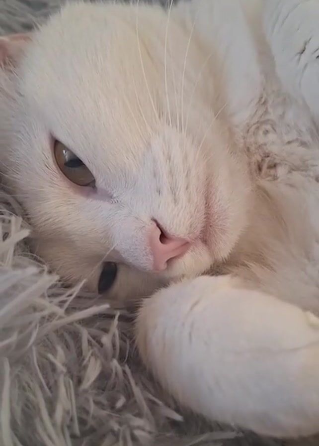 A white cat lies on a fuzzy gray blanket. Its eyes are partially closed, and it has a pink nose. The cat’s whiskers are long and white. The cat shifts its paw.