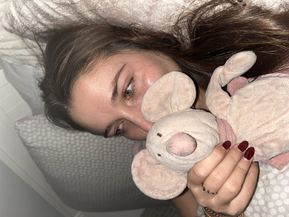 A young woman lies on a spotted pillow, clutching a plush mouse toy