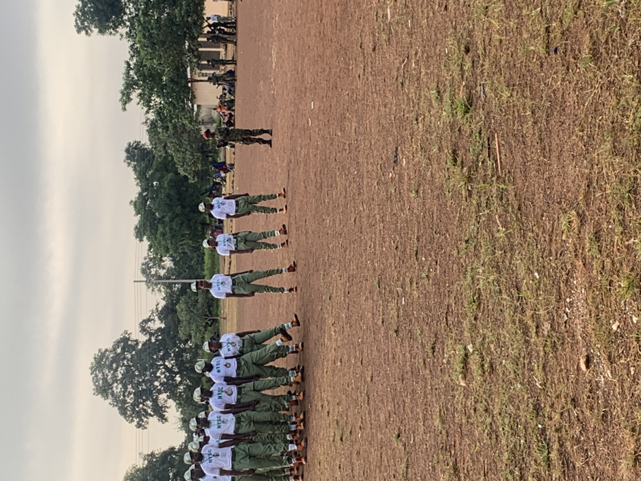 On an open, reddish-brown dirt field with sparse green patches in Kubi A, Nigeria, approximately 17-20 individuals are present. Fourteen individuals are observed in the foreground, arranged in a formation or line. They wear white t-shirts with "NYSC" branding, green trousers, and brown boots, with some also wearing matching green caps. One individual in this group has their left leg extended forward, mid-action. To their right and slightly forward, a single individual in a full military camouflage uniform and a red beret stands facing the formation, appearing to supervise or instruct. In the mid-ground and background, numerous trees are visible, along with utility poles and indistinct buildings. To the far right in the background, another group of people is present, some appearing to be seated or standing under trees. The sky is overcast and light gray.