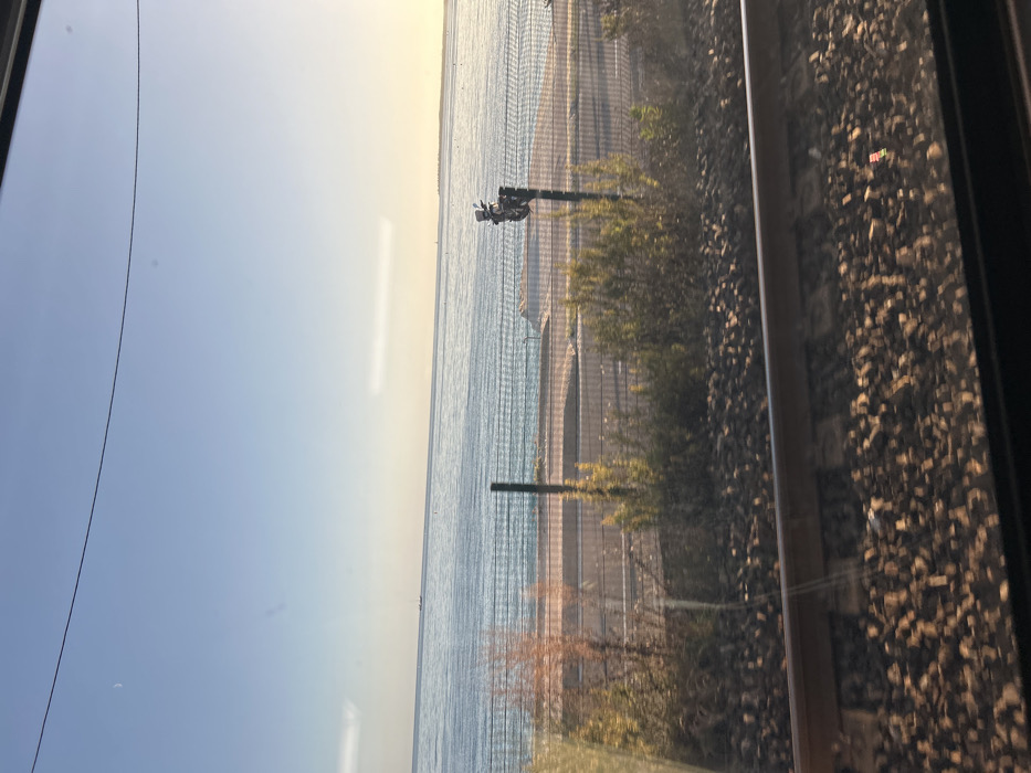 The image depicts a coastal landscape in Antibes, France, observed from a train window