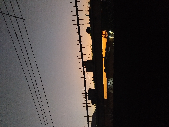 The image depicts a dusk or dawn scene. Power lines extend diagonally from the lower left, contrasted by a fence extending vertically with evenly spaced posts. A faint orange glow is visible behind the fence, possibly indicating a sunrise or sunset. The right side of the frame is dominated by a large dark area, obscuring the details in that section. The sky displays muted gray hues, creating a stark backdrop to the other elements in the frame.