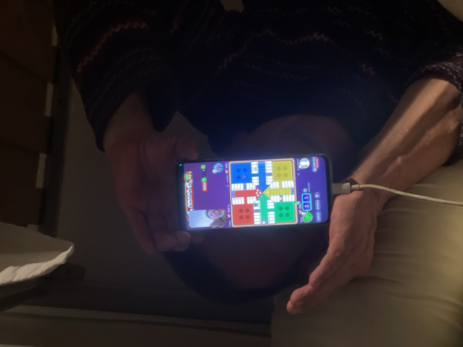 A person sits with a smartphone displaying a Ludo game. The phone is held horizontally, displaying a multiplayer game in progress with a video call visible at the bottom left. A charging cable is connected to the phone. The person's hand is visible on the right, resting on their leg. The person's other hand holds the phone, and they are wearing a dark-colored, patterned shirt.