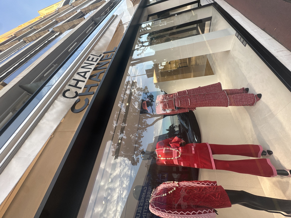 This image depicts the exterior of a Chanel boutique located in Cannes, France, identifiable by the prominent "CHANEL" signage above the display windows and mirrored text in the glass reflection, including "CANNES
