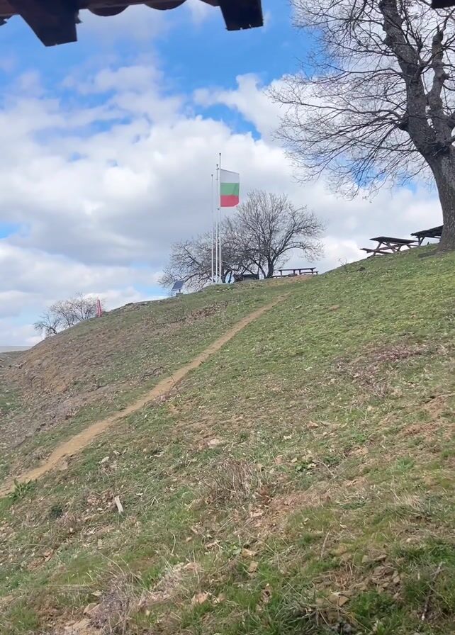 From under the overhang of a structure, a view is captured of a grassy hill dotted with trees. Near the crest of the hill, a Bulgarian flag stands tall, swaying gently in the breeze. Several picnic tables sit under the shade of a bare tree. A narrow dirt path winds its way up the slope. The sky above is a mix of blue and white, with fluffy clouds scattered across it. The landscape has a raw, natural feel, conveying a sense of rural or countryside charm.
