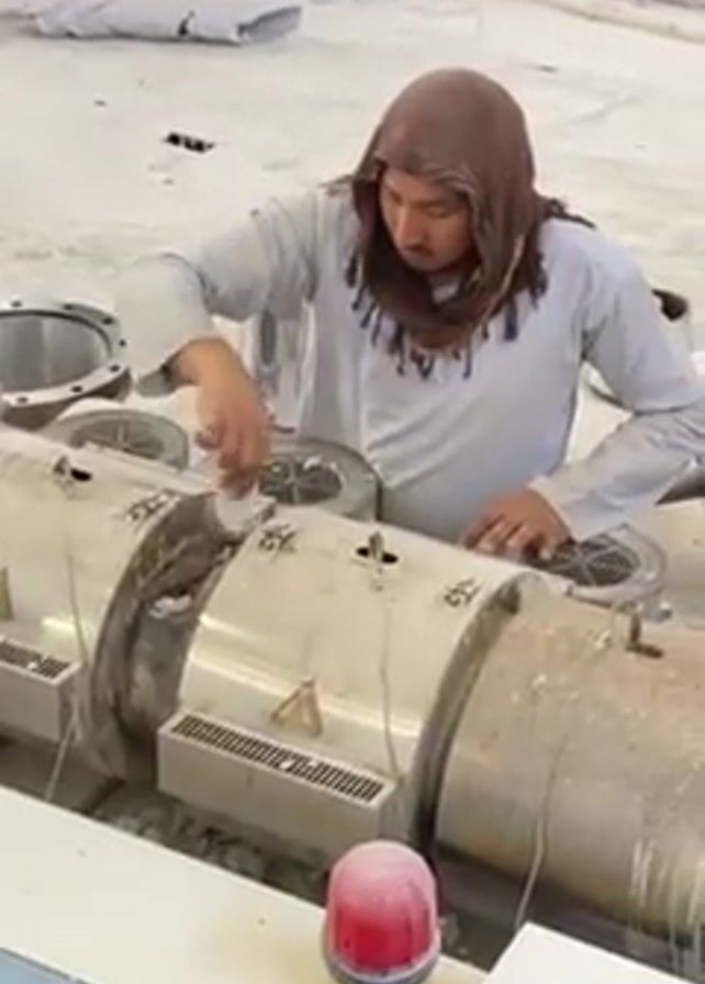 A man wearing a tan head covering and a light-colored shirt is working on a piece of machinery. He is leaning over the machine, which consists of several cylindrical metal sections with vents, and appears to be cleaning it. The machine is connected to a control panel with various buttons and a red emergency light. The environment is a spacious area with a concrete floor and scattered materials.