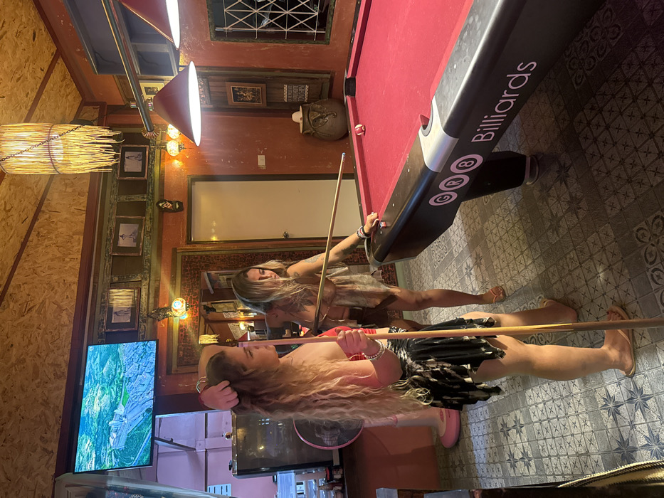 The image depicts an indoor scene in Thong Sala, Thailand, featuring two women engaged with a billiards table
