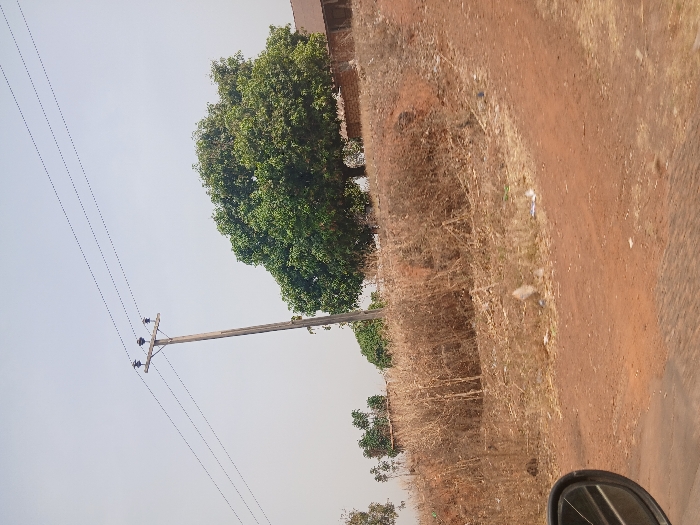 The scene depicts a dry, open outdoor landscape in Karshi, Nigeria, captured from within a vehicle, as evidenced by a black side mirror visible in the lower-left quadrant. A tall, weathered wooden utility pole, equipped with three insulators, supports three parallel overhead electrical wires against a pale, hazy sky that occupies the upper portion of the frame. To the right of the pole, on elevated ground, stands a large, dense tree with green foliage. Partially visible behind this tree is a section of a reddish-brown brick structure. The foreground and midground consist of a reddish-brown dirt path or unpaved road, with scattered white and blue litter. An embankment behind this path is covered extensively with dry, brown, withered vegetation. No human subjects or discernible actions are present.