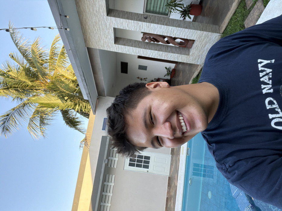 A smiling young man poses in front of a pool. He wears a navy blue long-sleeved shirt. Behind him, there is a house with a white door and windows. Palm trees are visible on the left, against a blue sky. Part of another building is visible, with plants and textured wall accents. The picture is taken outdoors in what looks like a sunny, tropical location.