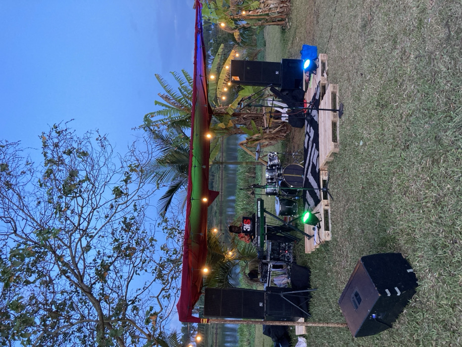 An outdoor stage setup with sound equipment on a pallet platform. A drummer sits behind a drum set, and a keyboard player in front of them. A colorful canopy hangs overhead with string lights. Lush green trees and grass surround the stage, with a body of water in the background reflecting the twilight sky. A speaker stands off to the right.