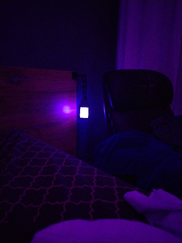 The scene depicts a dimly lit indoor environment, identified as being located in Plovdiv, Bulgaria. The room is predominantly illuminated by an artificial purple light source, creating deep shadows and purple hues across surfaces. In the left foreground, a section of a bed is visible, covered by dark bedding featuring a repeating light-colored geometric pattern, likely a quatrefoil design. Adjacent to the bed, a piece of wooden furniture, possibly a headboard or a bedside panel, is present. Mounted on the wall next to the wooden furniture is a dark, small device. This device emits a concentrated beam of intense purple light horizontally to the left and displays a distinct, illuminated square white light on its front face. The device appears to be attached to the wall by a dark, chain-link-like fixture. To the right side of the image, a dark-colored chair or seat is partially visible, with a piece of dark blue fabric draped over it. On the far right, a vertical segment of a light-colored curtain or drape is discernible. The wall in the background is dark. In the bottom right corner, a portion of a light-colored textile, possibly a pillow or blanket, is visible, also bathed in the pervasive purple light. No individuals or specific actions are depicted within the scene.