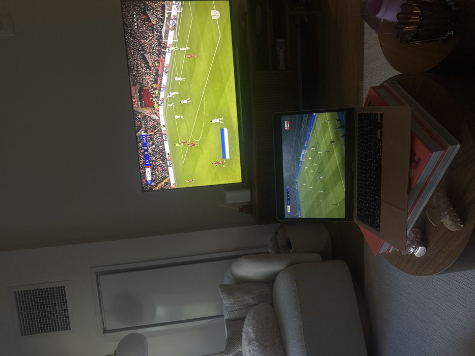 This image depicts a dimly lit residential living space located in Boston, United States. A large flat-screen television, positioned on a dark wooden media console, displays a live soccer match between "LIV" (Liverpool) and "RMA" (Real Madrid), with the score at 0-0 at the 2:29 mark. The broadcast shows "UNIVISION" and "EN VIVO" logos, with players in red and white kits on the field and "FedEx" advertisements on the hoardings. In the foreground, a rose gold Apple MacBook is open on a stack of two large reddish-orange books, resting on a round, dark wooden coffee table. The laptop screen shows a separate live soccer match between "PSG" (Paris Saint-Germain) and "BAY" (Bayern Munich), also 0-0, with an "ESPN" logo visible. Two decorative hair claws, one light and one pink, are on the coffee table next to the laptop. To the left, a light-colored upholstered armchair with a textured throw pillow is visible, along with a partial view of a spherical floor lamp and a woven basket. A smaller, round wooden side table to the right holds a dark, ridged candle holder and a purple object. A square air vent is positioned high on the left wall, above a partially visible tall white door frame. No individuals are present in the scene.