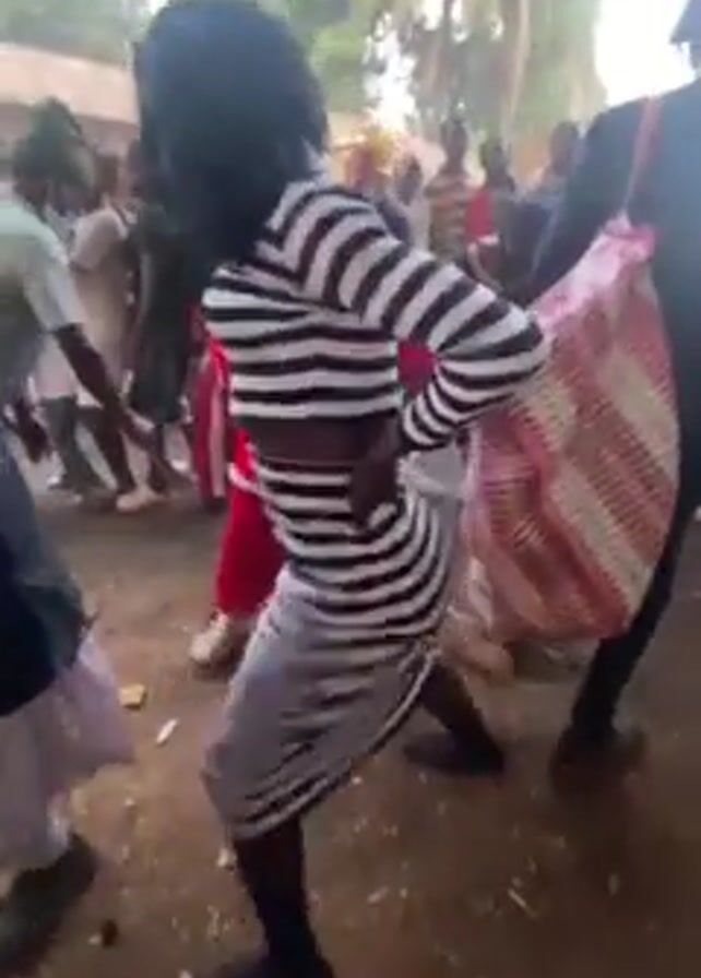 A low-angle medium shot shows a group of people dancing outdoors, on what appears to be dirt ground. In the center, a person in a tight, black and white striped dress with a black wig dances with another individual dressed as Santa Claus in a red suit. They both are performing rhythmic movements, seemingly enjoying the music. Other people surround them, some also dancing, wearing various casual clothes, including a red and white patterned woven fabric over their shoulder. Trees are visible in the background under an overcast sky.