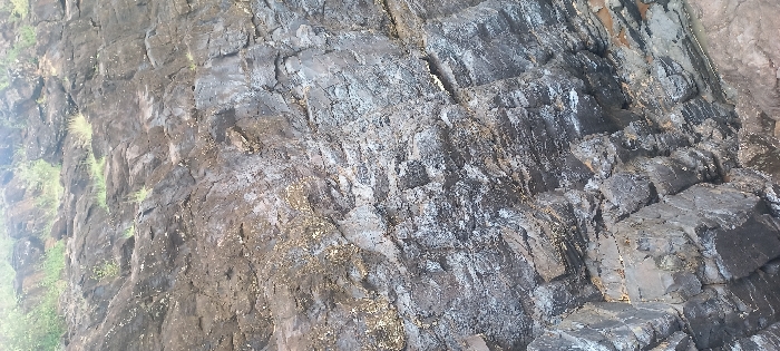 The image displays a rocky cliff face or outcrop situated in Ainamoj Village, Kenya. The rock formation consists primarily of dark grey to black sedimentary or layered igneous rock, characterized by visible stratification and fractures. Numerous sections of the rock surface appear wet or damp, reflecting light and exhibiting patches of white and light grey mineral deposits or efflorescence. Sparse green vegetation, consisting of grasses and small plants, is visible along the upper edge of the rock formation, indicating the ground level above. No individuals, animals, man-made objects, or discernible actions or interactions are present in the scene. The environment is natural and geological.