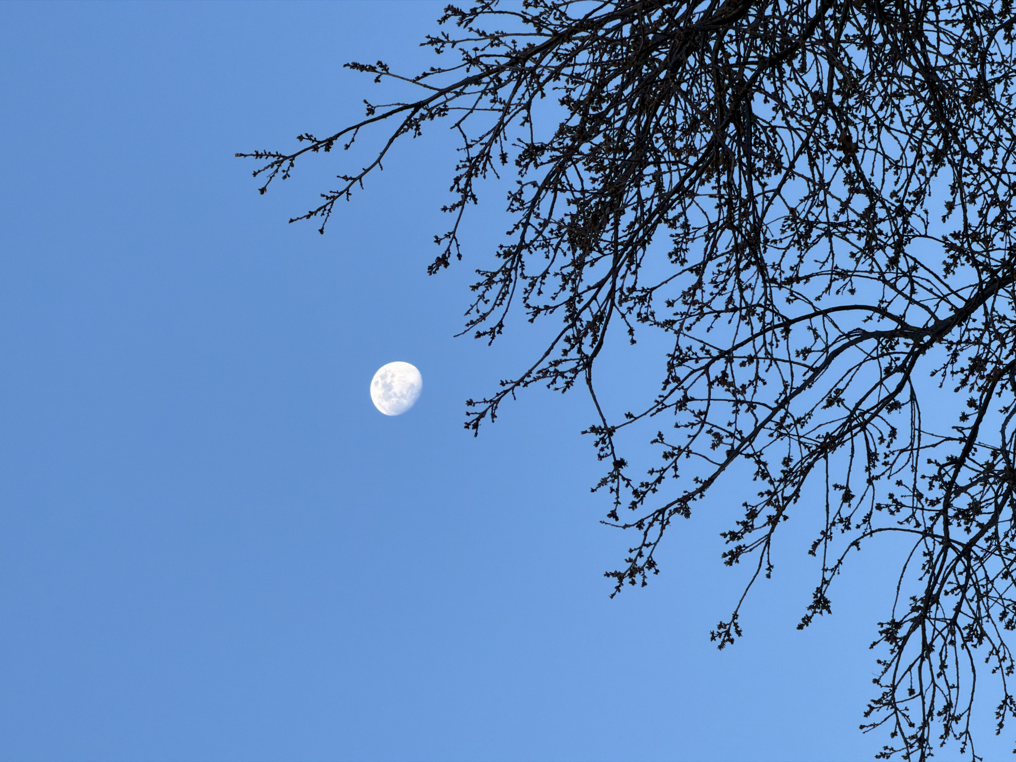 daytime sky with a blue hue. A nearly full moon is positioned in the left-center of the frame. In the upper-right quadrant, bare tree branches extend, creating a silhouette against the sky. The location, Pentre, United Kingdom, is not evident within the image itself.
