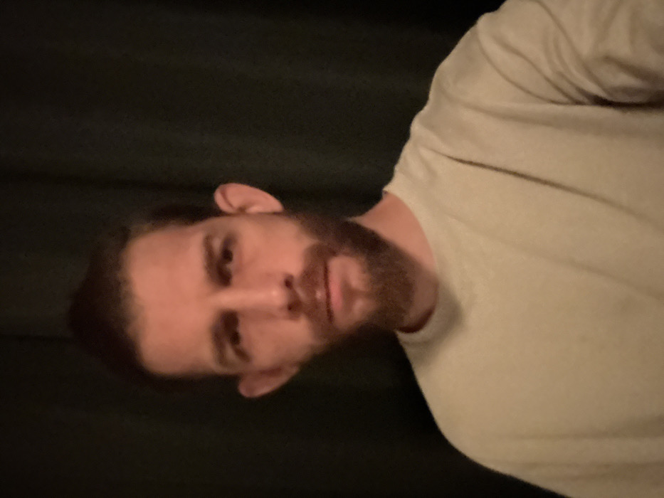 A single adult male is depicted in a close-up, chest-up portrait. The individual has a short, dark beard and mustache, dark hair, and prominent ears. He wears a plain, light-colored, possibly beige or off-white, crew-neck t-shirt. His gaze is directed forward, meeting the viewer's eye. The background is uniformly dark, appearing to be a plain wall or curtain, providing minimal environmental context. No specific objects or interactions beyond the direct gaze are visible. The lighting is low and appears to originate from the front. Based on the visual evidence provided, the location cannot be determined to be Saint Petersburg, Russia, or any specific city.