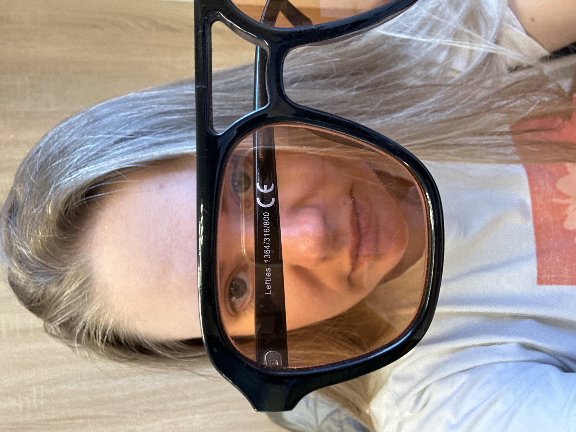 The image depicts a close-up, head-on view of an individual holding oversized black-framed sunglasses with orange-tinted lenses in front of their face. The location is specified as Ural'skoe, Russia. **People:** A single individual, an adult female, is partially visible. Her long, straight hair appears to be a mix of blonde and grey. Through the sunglasses' lenses, her right eye (viewer's left) is clearly visible, along with portions of her nose and mouth, which are distorted and tinted orange by the lenses. She is wearing a light-colored (likely white) t-shirt, with a blurred reddish-orange graphic visible on the lower right side of the frame. No specific actions are depicted beyond holding the sunglasses. **Subjects/Objects:** The primary subject is a pair of large, aviator-style sunglasses with thick black frames. The frames feature a distinctive double-bridge design with an open cut-out at the top. The lenses are a translucent orange or amber color. White alphanumeric text is visible on the inside of the sunglasses' frame, above the right lens from the wearer's perspective (viewer's left lens), reading "Lefties 1364/316/800 CE". The "CE" mark is present. **Environment:** The background is out of focus, suggesting an indoor setting. It appears to be a light brown, possibly wooden or wood-paneled wall, indicating an interior room. Lighting is ambient and soft, without harsh shadows.