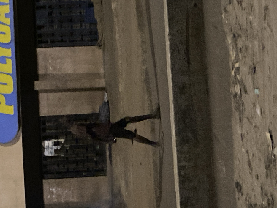 A person stands beside a concrete wall in a nighttime scene. The person is wearing dark shorts and has a lighter shirt. They appear to be leaning on the wall. A building with a blue and yellow sign is visible to the left. The wall is textured and dirty, and the ground to the right shows debris. The image is somewhat dark and grainy.