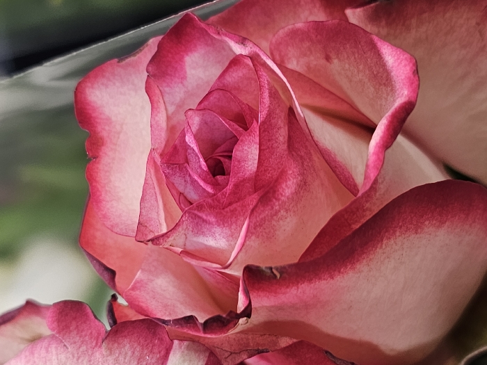 - "A close-up of a pink rose reveals tightly furled petals at its center, transitioning to larger, more open petals towards the edges" by FM-n22Rc2, licensed under CC BY 4.0