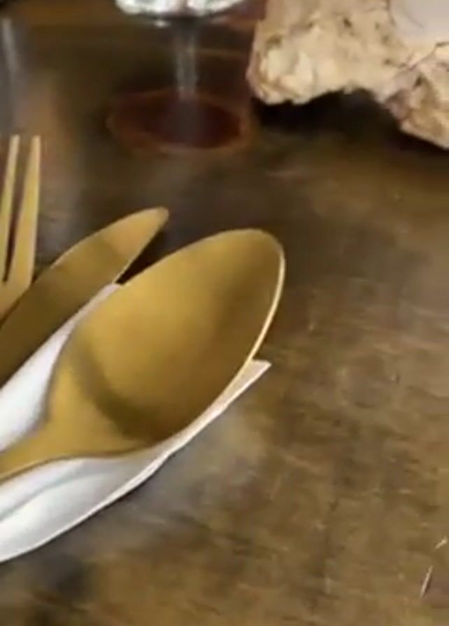 close-up of a table setting at a restaurant. The table is made of dark wood, and there are napkins folded into decorative shapes, some held together by small objects. There's also gold-colored silverware wrapped in a napkin and held together with a small, white, round item. One napkin holder looks like a piece of driftwood. A person's torso and arm can be seen in the background to the left, and a can of soda is visible behind another cutlery setting. The scene appears to be inside a restaurant, possibly near a window.