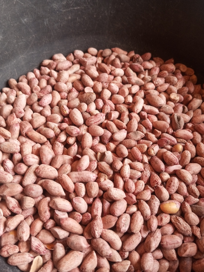 A close-up, high-angle shot displays a bulk quantity of raw, shelled peanuts, largely filling a dark, unidentifiable container, likely a bowl or tub, in the city of Unknown, Unknown. The peanuts exhibit varying shades of reddish-brown and light pink, retaining their textured skins. They are tightly packed, with individual units ranging in shape and size. A single prominent light yellow-tan peanut kernel is visible among the shelled nuts towards the right-center of the image. The upper portion of the container, dark grey to black and slightly textured, forms the background. No people, discernible actions, or interactions are present.