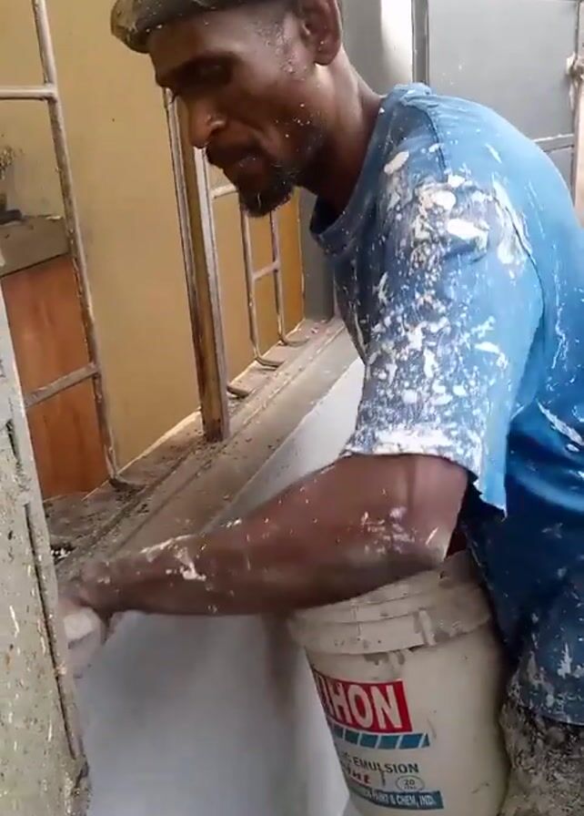 A man is painting a wall. He is wearing a blue shirt with white paint splattered on it, camouflage patterned pants, a bucket hat, and sandals. He has a dark complexion and a beard. He is standing next to a window, holding a white bucket labeled "Python Emulsion." He is using a sponge to apply grey paint to the wall. The wall is visible through the bars of the window. The background is a mix of a yellow wall and a silver metal door. The lighting is bright and natural.