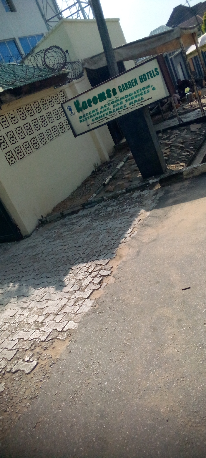 The image displays the exterior of Karomso Garden Hotels, located off Gahaja Junction in Lokoja, Nigeria