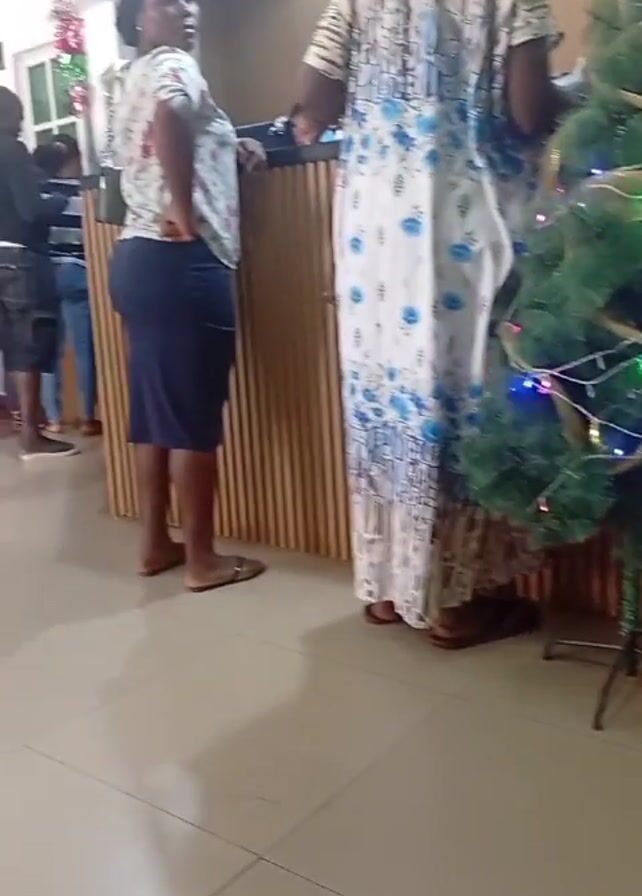 waiting area, likely in a hospital or clinic, with several people standing or sitting. In the foreground, a person wearing grey sweatpants, colorful socks, and sneakers is seated, with their legs and feet visible. Behind them, a woman in a floral shirt and navy blue skirt stands near the reception desk. To her right, another woman wearing a long white gown with blue floral patterns is also at the desk. A decorated Christmas tree stands next to them. Further back, other people are visible, including a man in a black jacket and patterned shorts, and a few other women entering or walking through a doorway. The floor is tiled and appears clean. The reception desk has a wood-like textured front.