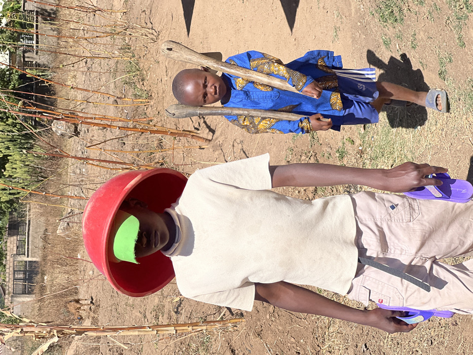 This image, captured in Udu, Nigeria, depicts an outdoor scene featuring two individuals and a goat under strong sunlight on a dry, reddish-brown dirt path. In the foreground and slightly to the left, a young person with dark skin stands wearing a large, inverted red plastic basin as a hat, under which a neon green visor is visible, obscuring their eyes. They are dressed in a light beige, high-collared, short-sleeved top and light tan cargo shorts secured with a dark strap. They hold a purple flip-flop in each hand. Behind and to the right of the first person, a younger child with dark skin walks. This child wears a blue long-sleeved tunic patterned with yellow and black motifs, blue shorts, and grey slide sandals. They are carrying two wooden-handled farming hoes, holding them upright with the handles extended above their shoulders. The background consists of sparse, dry vegetation, including thin, light brown stalks and branches. Further back, a light brown goat is visible standing on the dry ground. In the far background, a building with a dark metal gate and concrete walls is partially visible under a clear sky.