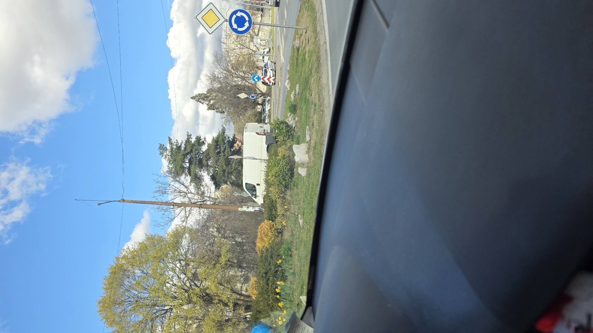 The image, captured from inside a vehicle, depicts a road scene near Blagoevgrad, Bulgaria, in the springtime. Several road signs are visible, including a diamond-shaped sign indicating a right-of-way priority and a blue circular sign for a roundabout. A white van is parked on the side of the road amidst vegetation. The landscape features blossoming trees and shrubs, characteristic of the season. The sky is partly cloudy, showing a mix of blue sky and white clouds. A utility pole and wires are seen against the sky.