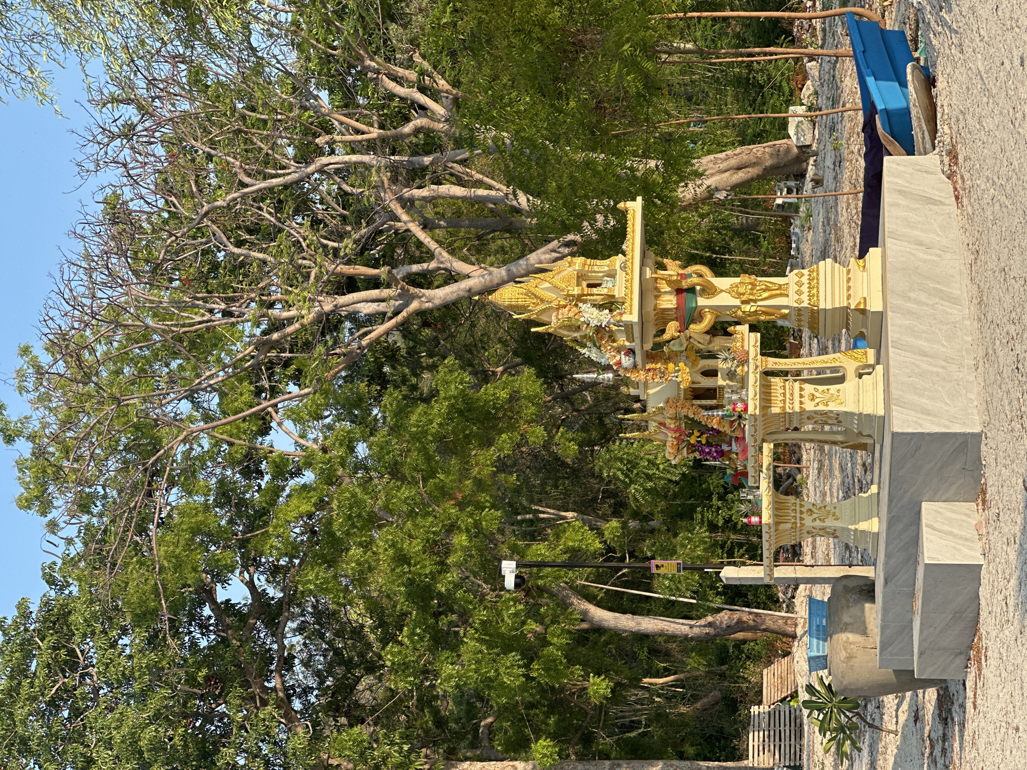 n outdoor scene in Pattaya City, Thailand. A Thai spirit house, ornately decorated and painted gold, stands prominently on a concrete base. Offerings like flowers adorn the structure. The spirit house is set against a backdrop of lush green trees and vegetation. A security camera is visibly attached to one of the trees. In the background, a small blue boat rests on the ground. The ground appears to be covered with light-colored gravel or sand. The sky is clear and blue.