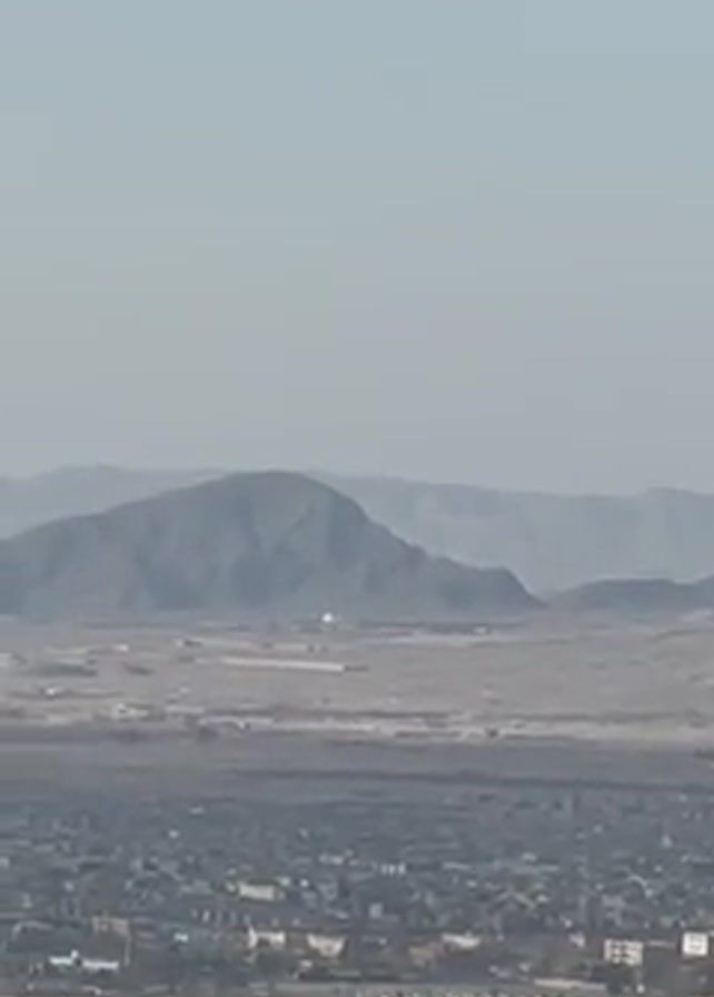 panoramic view of a city and surrounding landscape from a high vantage point. The city is densely built with tightly packed buildings, visible in the foreground. In the distance, a flat expanse leads to a series of low, hazy mountains. The sky is light blue with a few scattered clouds. The second shot presents a more arid landscape, with a barren foreground leading to a grid-like structure and then the city and mountains in the distance under a clear blue sky. The overall scene is wide and expansive, emphasizing the scale of the landscape and the city's placement within it.