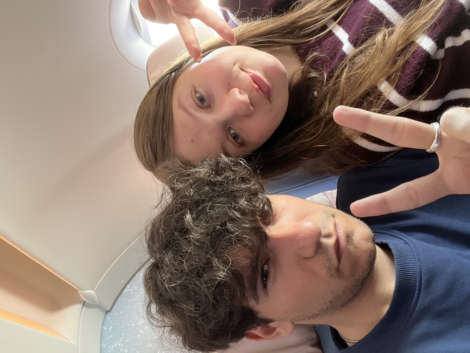 The scene depicts two individuals inside an airplane cabin in Tokoname, Japan. A male subject is positioned on the left, featuring dark, curly hair, stubble on his face, and wearing a dark blue crew-neck sweater with a silver chain necklace. He is holding his right hand up, forming a peace sign, and wears a silver ring on his right ring finger. His expression is neutral. A female subject is on the right, with long brown hair, smiling faintly, and wearing a maroon and white striped sweater. She is holding her right hand up, forming a "rock on" gesture. Both subjects are looking towards the camera. The background reveals white overhead airplane panels, a light blue window shade or view of sky through a window on the upper left, and a bright light source from an adjacent window on the upper right. Light blue seat upholstery is visible behind the male.