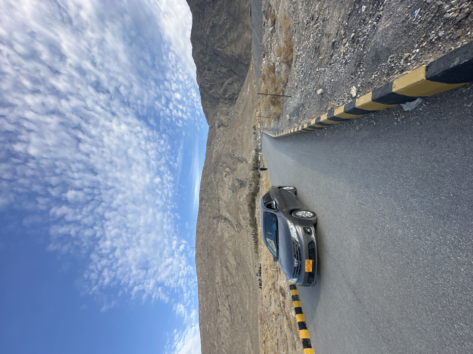 The image captures an arid, mountainous landscape within Quetta City Tehsil, Pakistan, under a clear blue sky with widespread small, white cumulus clouds. A dark grey sedan, a Toyota Corolla with license plate ATY-988, is positioned prominently on a paved asphalt road, angled slightly towards the right side of the frame. The road is bordered by black and yellow painted curb stones. To the right of the road, the terrain consists of dry, rocky ground with sparse, light-brown vegetation and several bare wooden posts. In the mid-ground, a lone individual in dark clothing stands on the roadside, facing away from the camera. Further into the background, on the left side of the road, a cluster of tents or temporary structures and several indistinct figures are visible at the base of a mountain. The background is dominated by a range of barren, brown-grey mountains. Several tall, slender structures, potentially communication towers, are discernible along the crest of a mountain ridge in the far left. The lighting is bright and even, indicative of daytime conditions.
