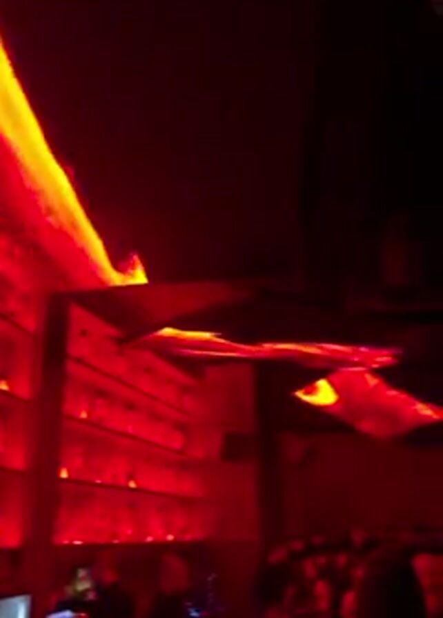 interior of a nightclub illuminated with red lights. The back of the bar has a shelf full of bottles. Above the crowd is a flat, angular structure that appears to be displaying a projection of moving flames. A circular, lighted element is visible on the ceiling as well. People are present in the crowded space, though their individual features are indistinct. The scene is lively.