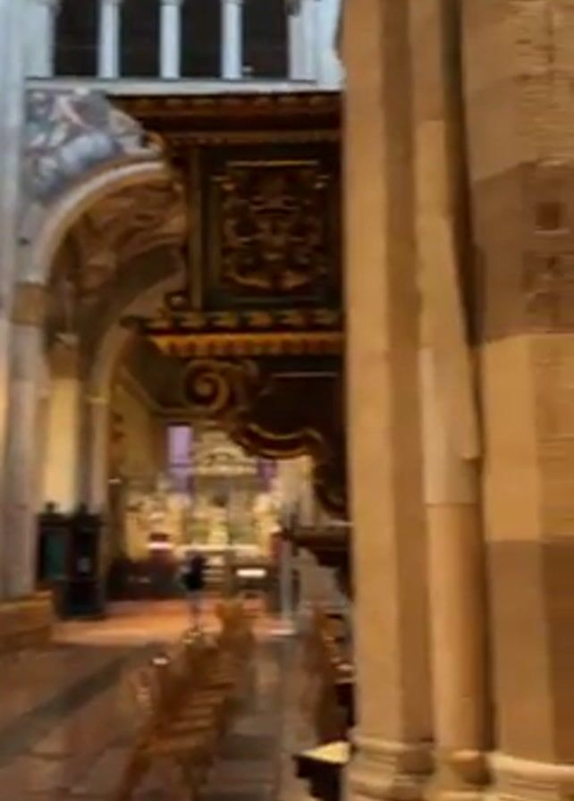 The camera pans across the interior of a grand cathedral. Rows of simple wooden chairs are arranged on a red-tiled floor. Ornate stone arches support the high, vaulted ceiling, which is adorned with colorful murals. A richly decorated wooden pulpit stands on a large stone column, reached by a wooden staircase. A lone individual walks in the background. The overall impression is one of age, grandeur, and reverence.