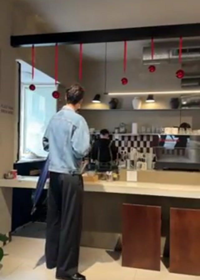 A man in a jean jacket and black trousers stands at a coffee shop counter, holding a drink